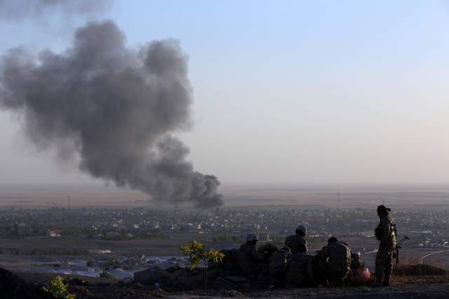 Iraqi Kurdish Peshmerga fighters look on as smoke billows from the town of Makhmur on Aug 9