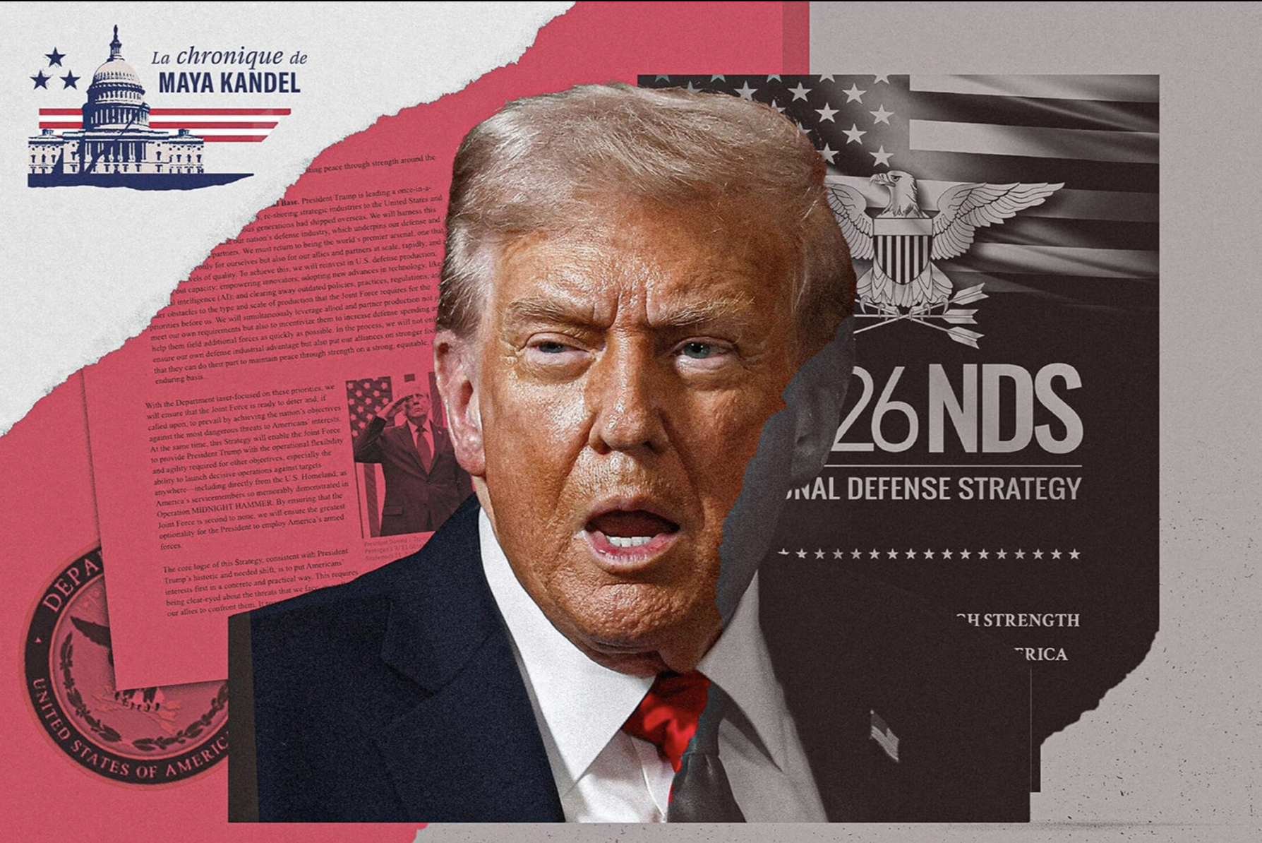 La version non classifiée du document compte 34 pages, dont 25 de texte, écrites sur un ton politique inédit pour une stratégie militaire. Un avant-goût avait été donné avec la stratégie de sécurité nationale publiée début décembre 2025. La stratégie est trumpiste jusque dans sa présentation, qui fait la part belle aux dorures et aux photos du président, mentionné 52 fois, alors que ce genre de document a d’ordinaire des allures bien plus austères.